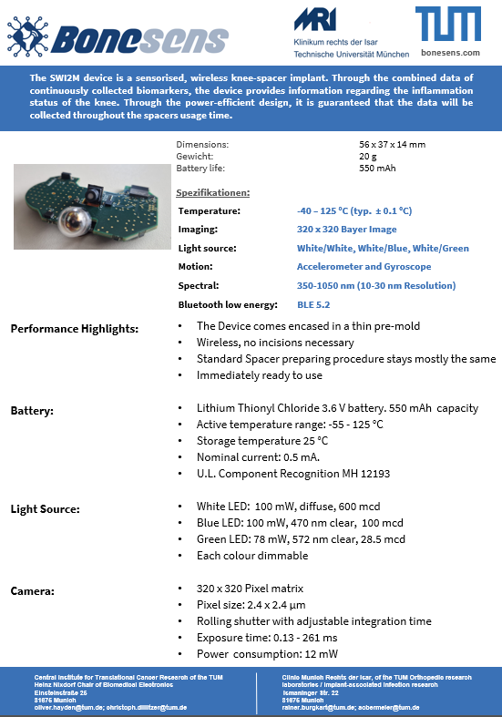 - 07/2022: To date, using initial 3D-printed and/or encapsulated Bluetooth-enabled SmartSpacer prototypes, we have been able to capture live intra-articular images and videos using ex vivo human and porcine knee samples. Furthermore, the built-in acceleration and temperature sensors show perfect functionality even in the encapsulated state.